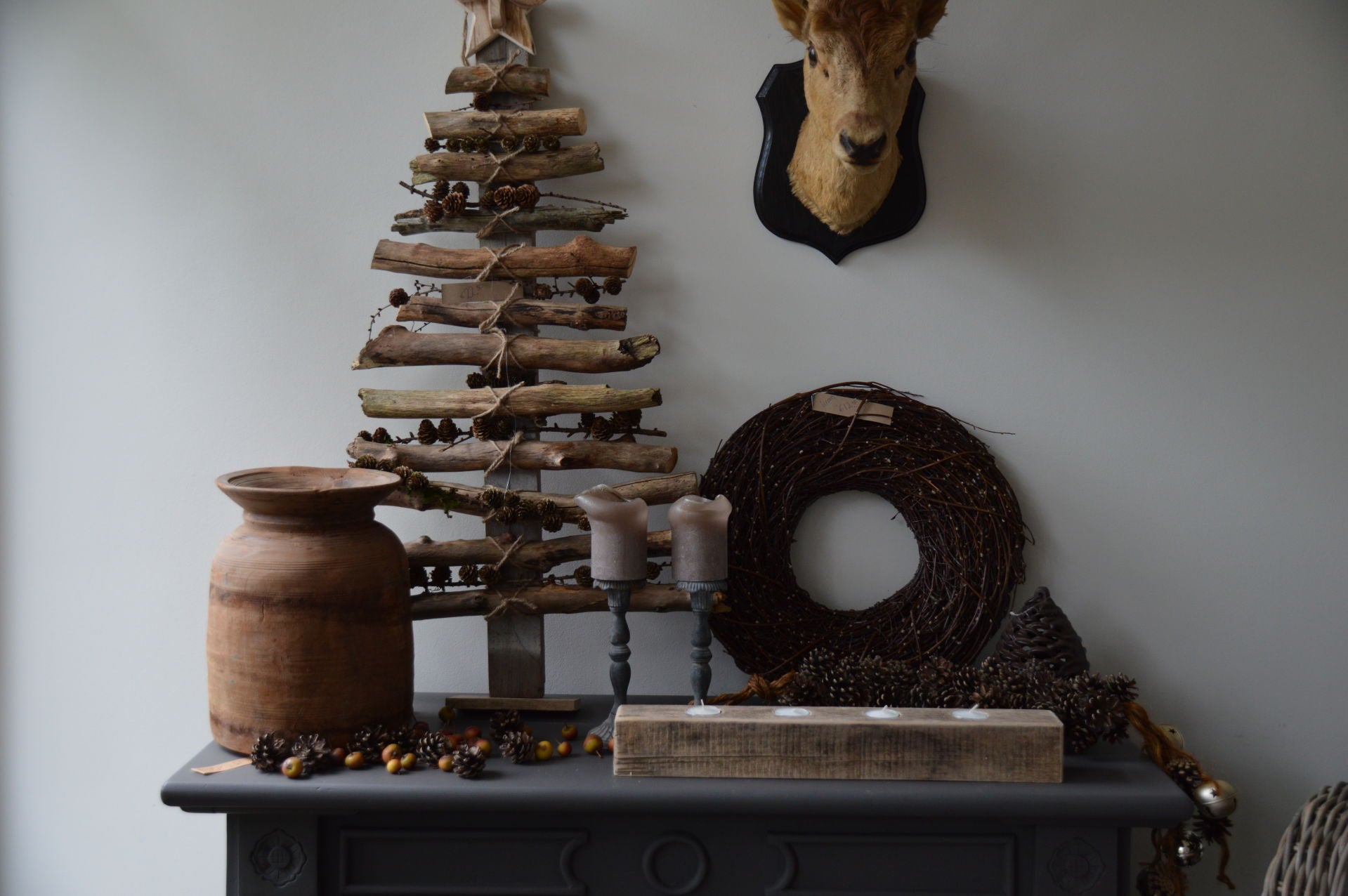 Oude rabatdelen van een schuur werden een kerstboom, takken en oude tollen werd een mooie toef