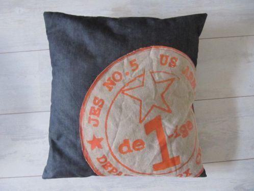 Stempel gedrukt(druksel ligt er als reliëf op) op postzakkenstof en deze is als applicatie op kussen genaaid. MADE by Dubbel Genieten