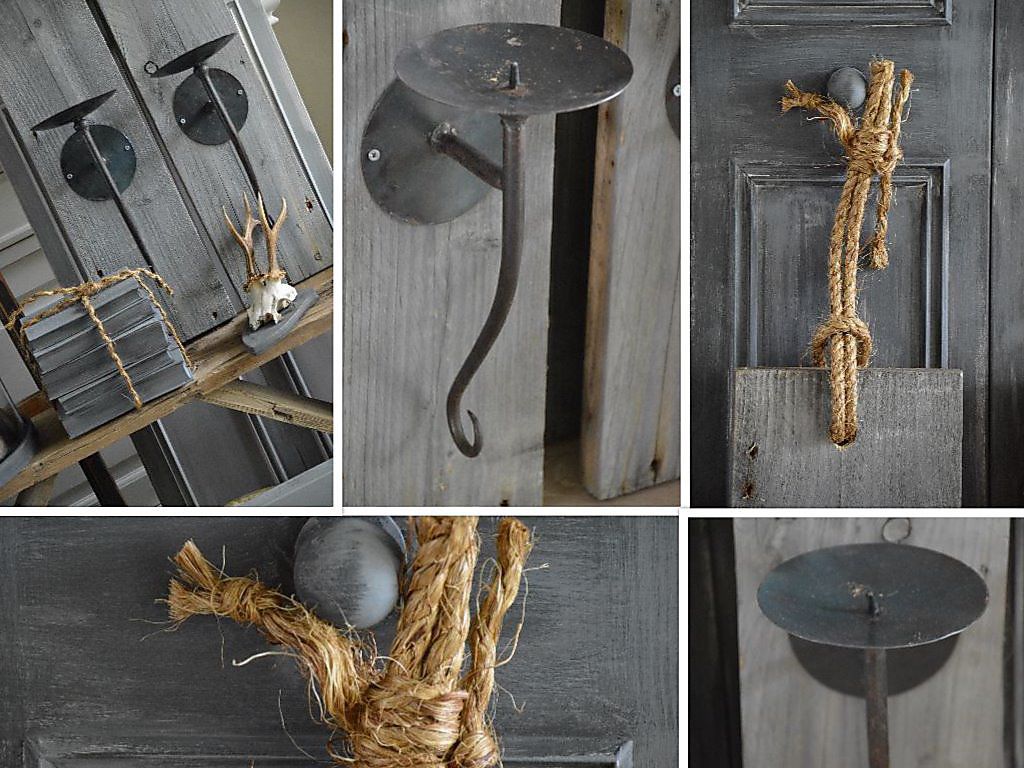 Wand kandelaars GIETIJZER op doorleefde plank 78 cm hoog en 19 cm breed Prachtige sisalhaak van touw
